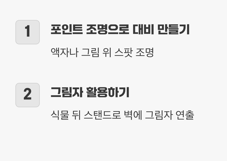 조명을 잘 활용한다는 것은, 빛과 그림자를 함께 디자인한다는 의미입니다. 밝은 곳과 어두운 곳의 대비를 만들어 주어야 공간이 더 입체적이고 흥미롭게 느껴집니다. 이를 위해 필요한 것이 바로 ‘포인트 조명(Accent Lighting)’입니다.