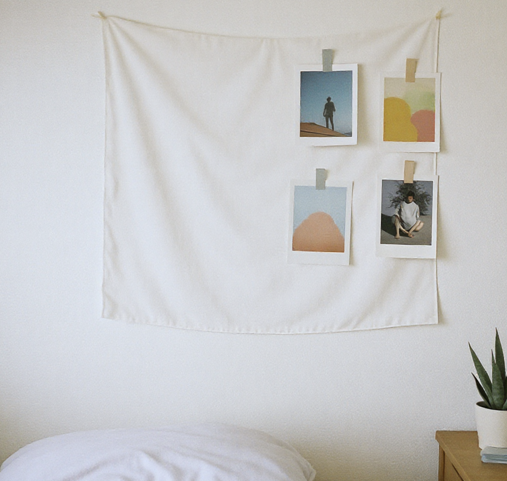 좋아하는 그림이나 패턴이 인쇄된 천 포스터 한 장을 꼭꼬핀이나 양면테이프로 벽에 걸어보세요. 허전했던 벽면을 가득 채워주면서 공간에 따뜻함과 개성을 더해줍니다. 한 장에 만 원 내외로 구매할 수 있으며, 방의 테마를 결정하는 가장 쉽고 효과적인 방법입니다. 더 적은 비용을 원한다면, 마음에 드는 엽서나 잡지 사진 여러 장을 마스킹 테이프로 붙이는 것만으로도 멋진 갤러리 월을 만들 수 있습니다.