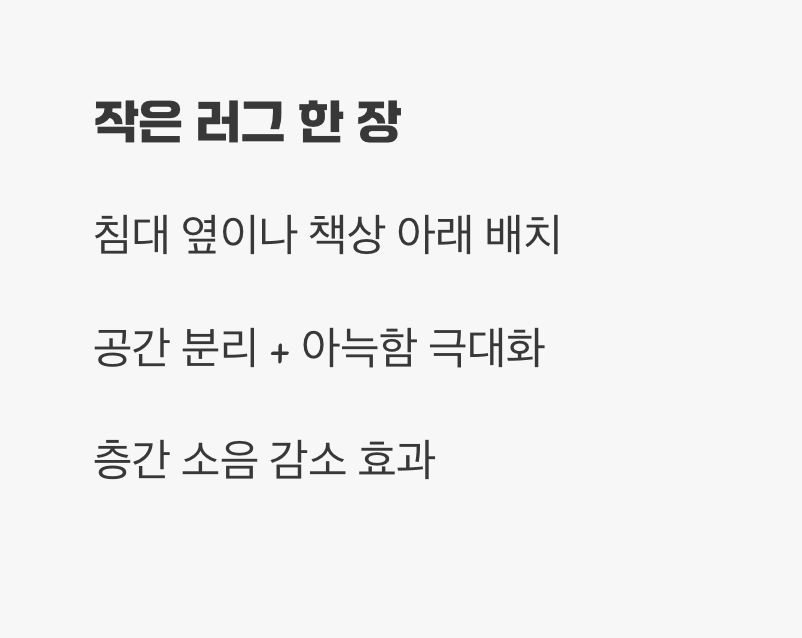 부드러운 촉감의 작은 원형 러그나 미니 사이즈의 사각 러그 한 장은, 공간을 시각적으로 분리해 주면서 아늑함을 극대화하는 최고의 가성비 아이템입니다. 발이 닿는 곳에 따뜻한 감촉을 더해주는 것만으로도 삶의 질이 달라지는 것을 느낄 수 있습니다. 또한, 층간 소음을 줄여주는 효과도 덤으로 얻을 수 있죠.