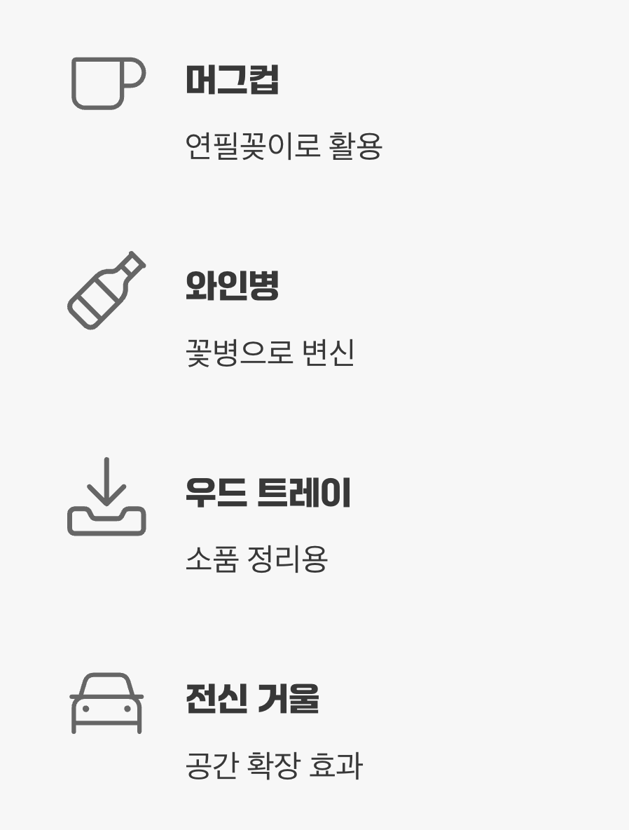 예쁜 머그컵은 연필꽂이로, 선물 받은 와인병은 근사한 꽃병으로 변신할 수 있습니다. 다이소에서 구매한 몇천 원짜리 우드 트레이 위에 자주 쓰는 액세서리나 향수를 올려두는 것만으로도 정돈된 느낌을 줄 수 있죠. 벽에 기대어 세워두는 전신 거울은 공간을 더 넓어 보이게 하는 착시 효과와 함께 훌륭한 포토존이 되어줄 것입니다.