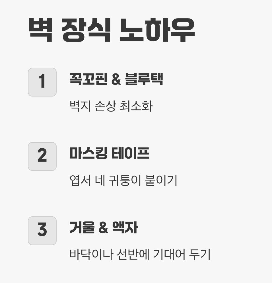 A. ‘꼭꼬핀’이나 ‘블루택’ 점토 접착제를 사용하면 벽지 손상을 최소화하면서 가벼운 소품을 걸 수 있습니다. 예쁜 디자인의 마스킹 테이프로 엽서의 네 귀퉁이를 붙이는 것도 그 자체로 멋진 장식이 됩니다. 거울이나 액자는 벽에 걸기보다, 바닥이나 선반에 무심하게 기대어 두는 것이 더 세련된 연출법이 될 수 있습니다.
