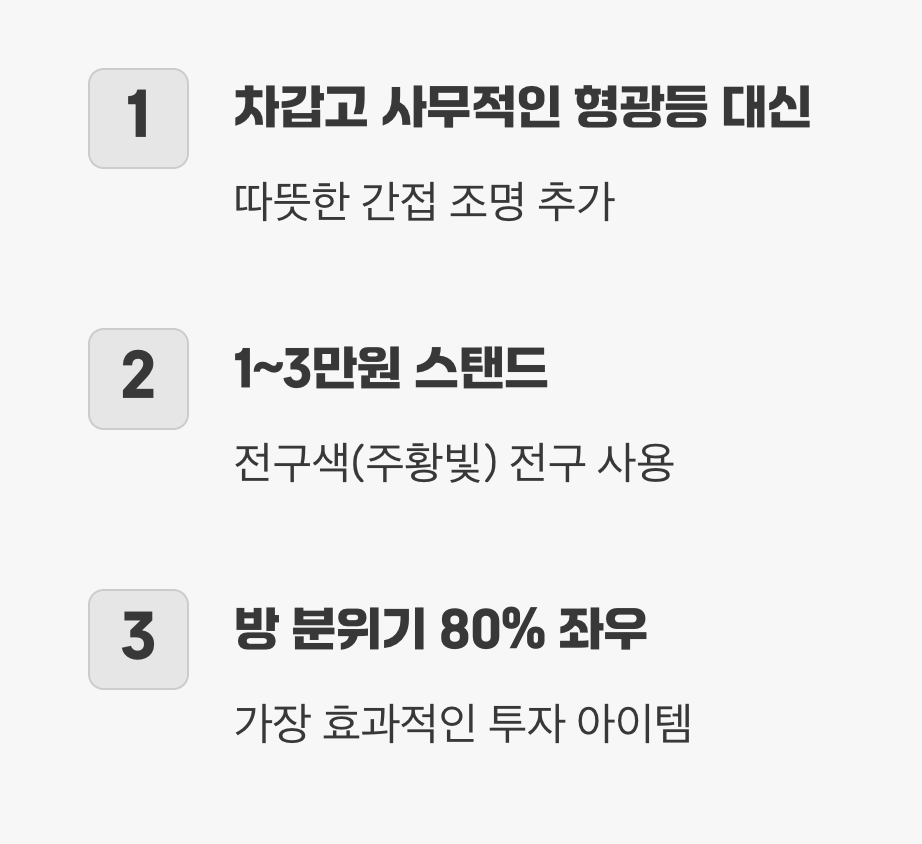 자취방에 기본 옵션으로 달려있는 하얀 형광등은 공간을 밝혀줄지는 몰라도, 차갑고 사무적인 느낌을 줍니다. 우리에게 필요한 것은 휴식과 안정감을 주는 따뜻한 분위기죠. 방의 전체적인 인상을 바꾸는 가장 가성비 좋은 방법은 단연코 ‘간접 조명’을 추가하는 것입니다.