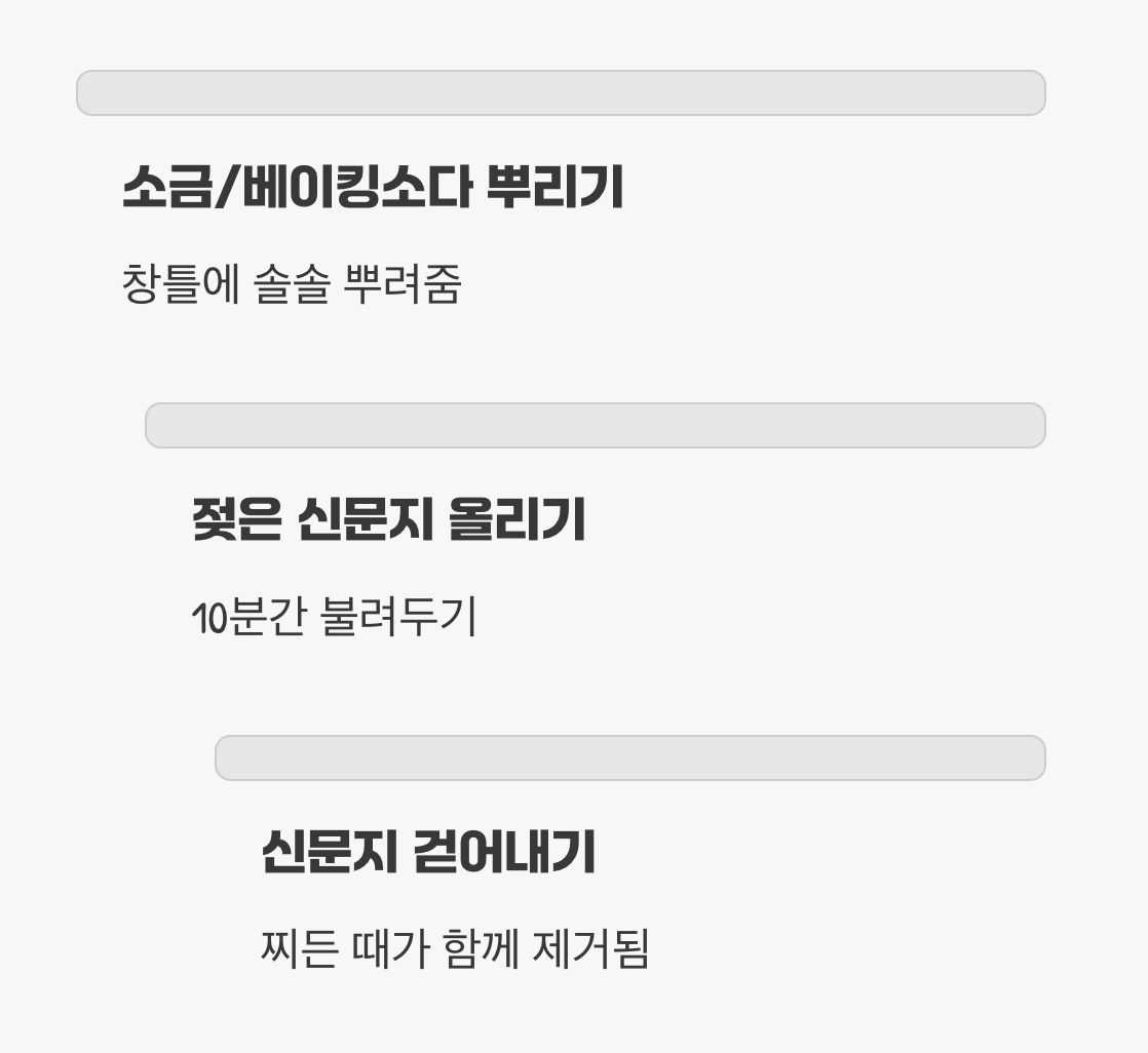 이럴 때도 신문지가 활약합니다. 굵은소금이나 베이킹소다를 창틀에 솔솔 뿌려준 뒤, 물에 흠뻑 적신 신문지를 길게 찢어 창틀 모양에 맞게 올려두고 10분 정도만 불려주세요. 시간이 지난 뒤 신문지를 걷어내면, 찌든 때가 불어서 함께 묻어 나옵니다. 남은 때는 낡은 칫솔이나 나무젓가락에 물티슈를 감아 닦아내면, 손쉽게 깨끗한 창틀을 만들 수 있습니다.