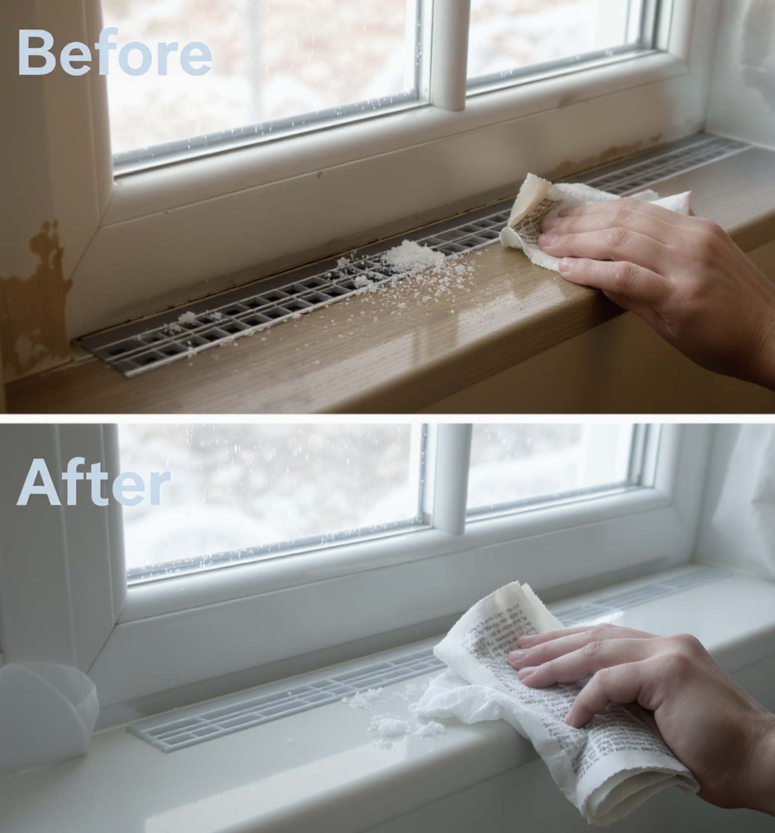 2단계: 창틀의 찌든 때, 불려서 닦아내기