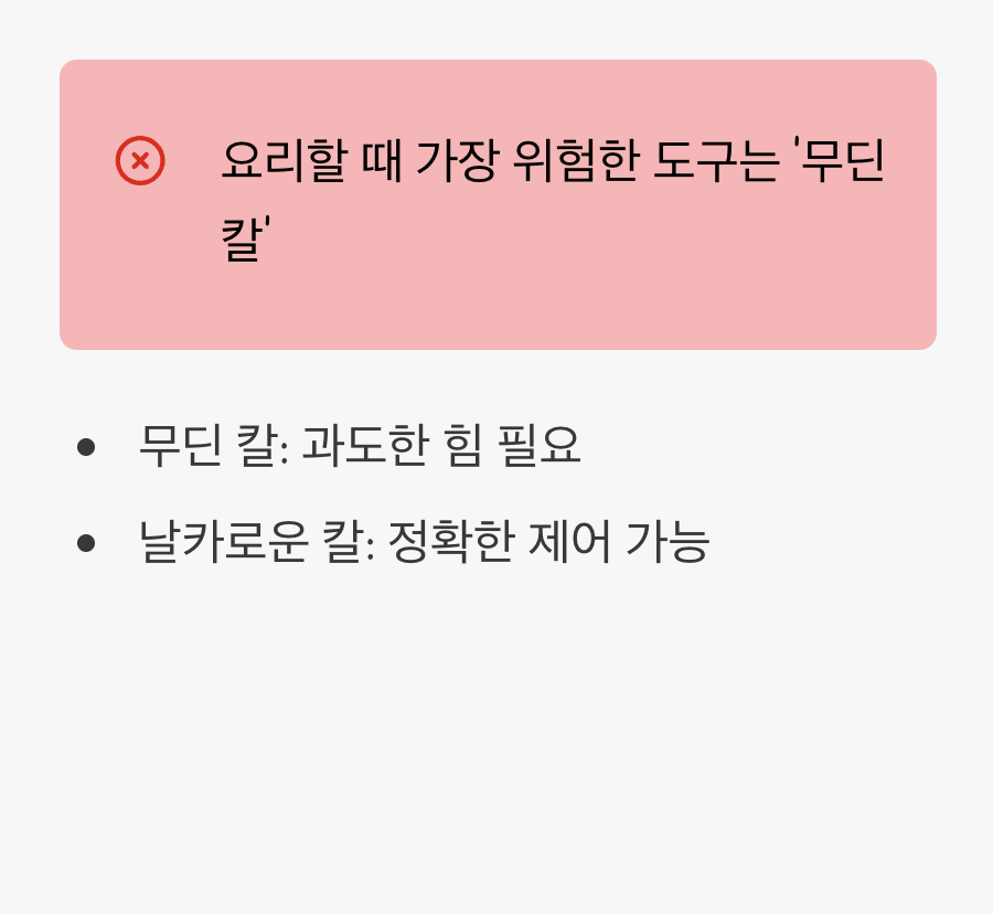 이때 칼날이 재료를 파고들지 못하고 옆으로 미끄러지면서, 더 큰 사고로 이어질 수 있습니다. 반면, 잘 드는 칼은 적은 힘으로도 식재료의 조직을 부드럽게 가르기 때문에, 내가 원하는 방향으로 정확하게 움직여 오히려 훨씬 안전합니다. 잘 드는 칼은 위험한 도구가 아니라, 나의 의도대로 움직여주는 믿음직한 파트너입니다.