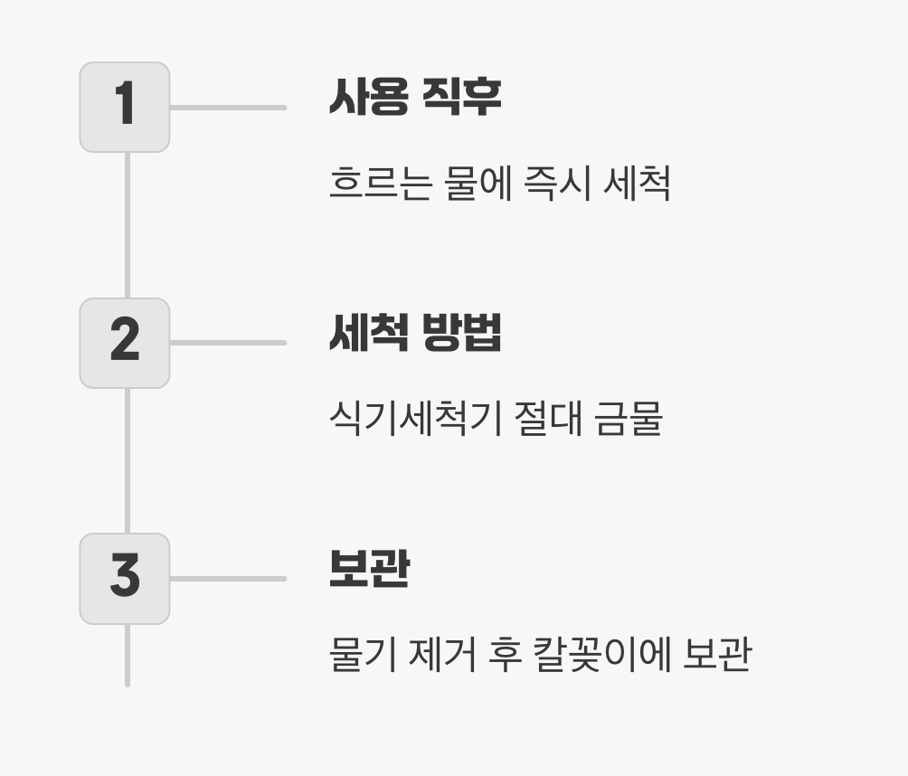아무리 좋은 칼도, 사용 후 관리를 제대로 하지 않으면 금방 녹슬고 무뎌져 버립니다. 칼의 수명을 결정하는 가장 중요한 골든타임은 바로 사용 직후의 1분입니다. 음식물의 산성이나 염분은 칼날을 부식시키는 주된 원인이므로, 사용 후에는 즉시 흐르는 물에 부드러운 수세미로 닦아주는 습관을 들여야 합니다.