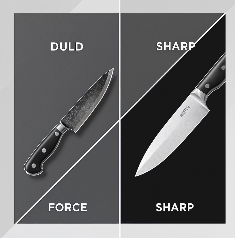 “칼이 너무 잘 들면 무서워요.” 많은 분이 하는 말이지만, 이는 정말 위험한 착각입니다. 오히려 요리할 때 가장 위험한 도구는 바로 ‘무딘 칼’입니다. 잘 들지 않는 칼로 단단한 재료를 자르려면, 어깨와 팔에 잔뜩 힘을 주어 칼을 억지로 누르게 됩니다.