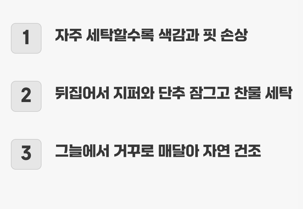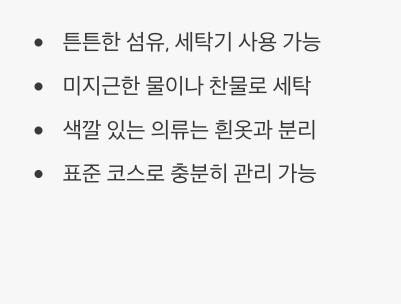 다만, 높은 온도의 물에서는 수축하거나 색이 빠질 수 있으므로, 미지근한 물이나 찬물로 세탁하는 것이 좋습니다. 특히 색깔이 있는 의류는 반드시 흰옷과 구분하여 세탁해야, 다른 옷에 물드는 대참사를 막을 수 있습니다. 세탁기의 표준 코스로도 충분히 깨끗하게 관리할 수 있는 가장 다루기 쉬운 소재입니다.