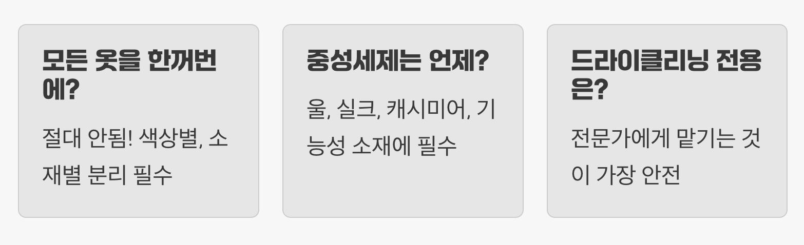 A. 물세탁 시 형태 변형이나 수축 위험이 매우 큰 옷이라는 의미이므로, 가급적 전문가에게 맡기는 것이 가장 안전합니다. 특히 실크, 레이온 비율이 높거나, 어깨 패드가 들어간 재킷, 고급 코트 등 구조가 복잡한 옷은 절대로 집에서 세탁하면 안 됩니다.