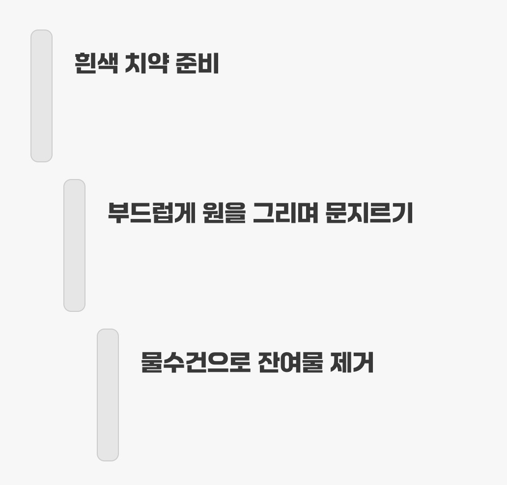 부드러운 천이나 마른 헝겊에 치약을 콩알만큼 묻혀 낙서가 있는 부위를 살살 문질러 줍니다. 강하게 문지르기보다는 원을 그리듯 부드럽게 닦아내는 것이 중요합니다. 낙서가 지워졌다면 물기를 꼭 짠 물수건으로 치약 잔여물을 깨끗하게 닦아내고, 마른 천으로 마무리하면 끝입니다.