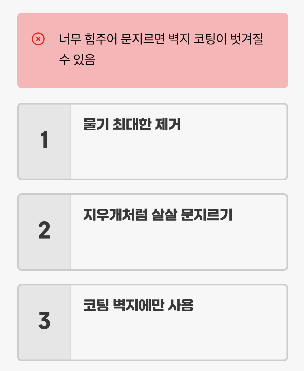 하지만 강력한 만큼 주의가 필요합니다. 매직블록은 미세하게 표면을 깎아내는 원리이므로, 너무 힘주어 문지르면 벽지의 코팅이나 무늬까지 벗겨질 수 있습니다. 물에 적신 매직블록의 물기를 최대한 제거한 뒤, 지우개로 지우듯 아주 살살, 필요한 부분만 문질러야 합니다. 실크벽지처럼 코팅이 된 벽지에만 제한적으로 사용하시길 권장합니다.