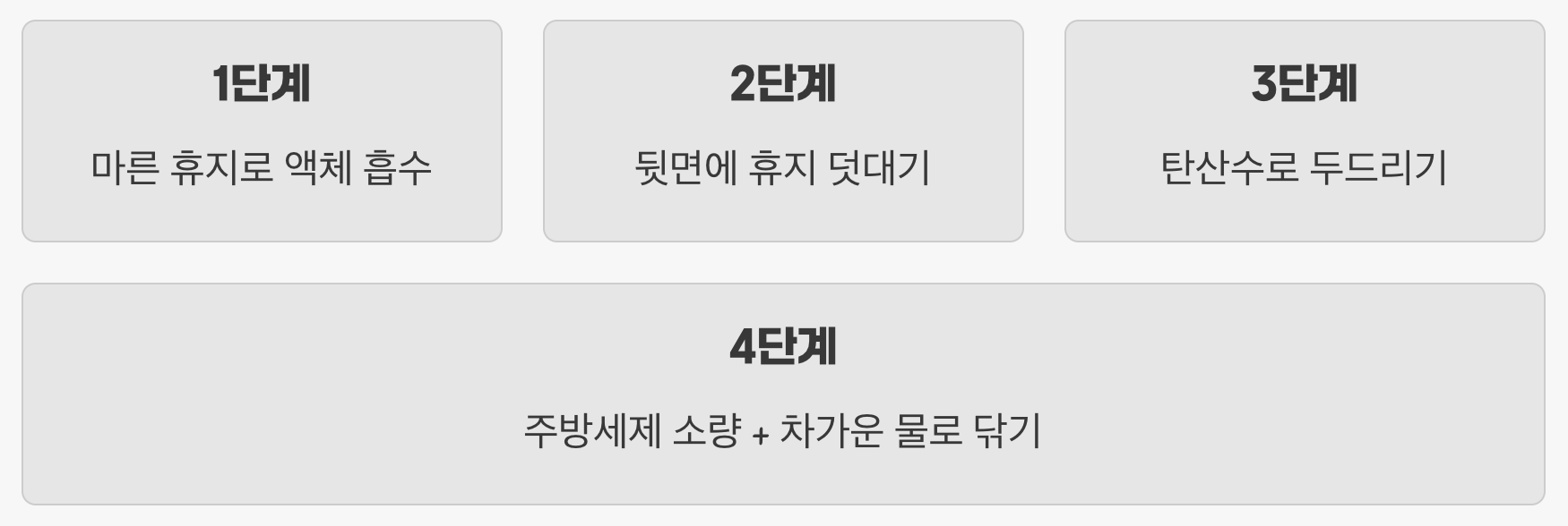 만약 얼룩이 심하다면, 주방 세제를 소량 묻혀 가볍게 두드려준 뒤, 차가운 물에 적신 휴지로 세제 성분을 여러 번 닦아내면 됩니다. 이 과정을 거치면, 얼룩이 눈에 띄게 옅어지는 것을 확인할 수 있습니다.