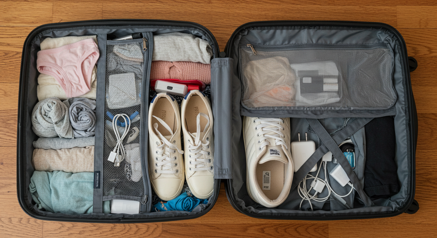 예를 들어, 신발 안쪽에는 양말이나 속옷, 혹은 깨지기 쉬운 작은 화장품 샘플 등을 넣어 완충 효과와 공간 활용을 동시에 노릴 수 있습니다. 충전기나 케이블처럼 형태가 자유로운 물건들은 단단한 물건들 사이의 빈틈을 채우는 데 안성맞춤입니다. 이렇게 숨은 공간을 찾아 채워 넣는 것만으로도 작은 파우치 하나 정도의 공간을 추가로 확보할 수 있습니다.