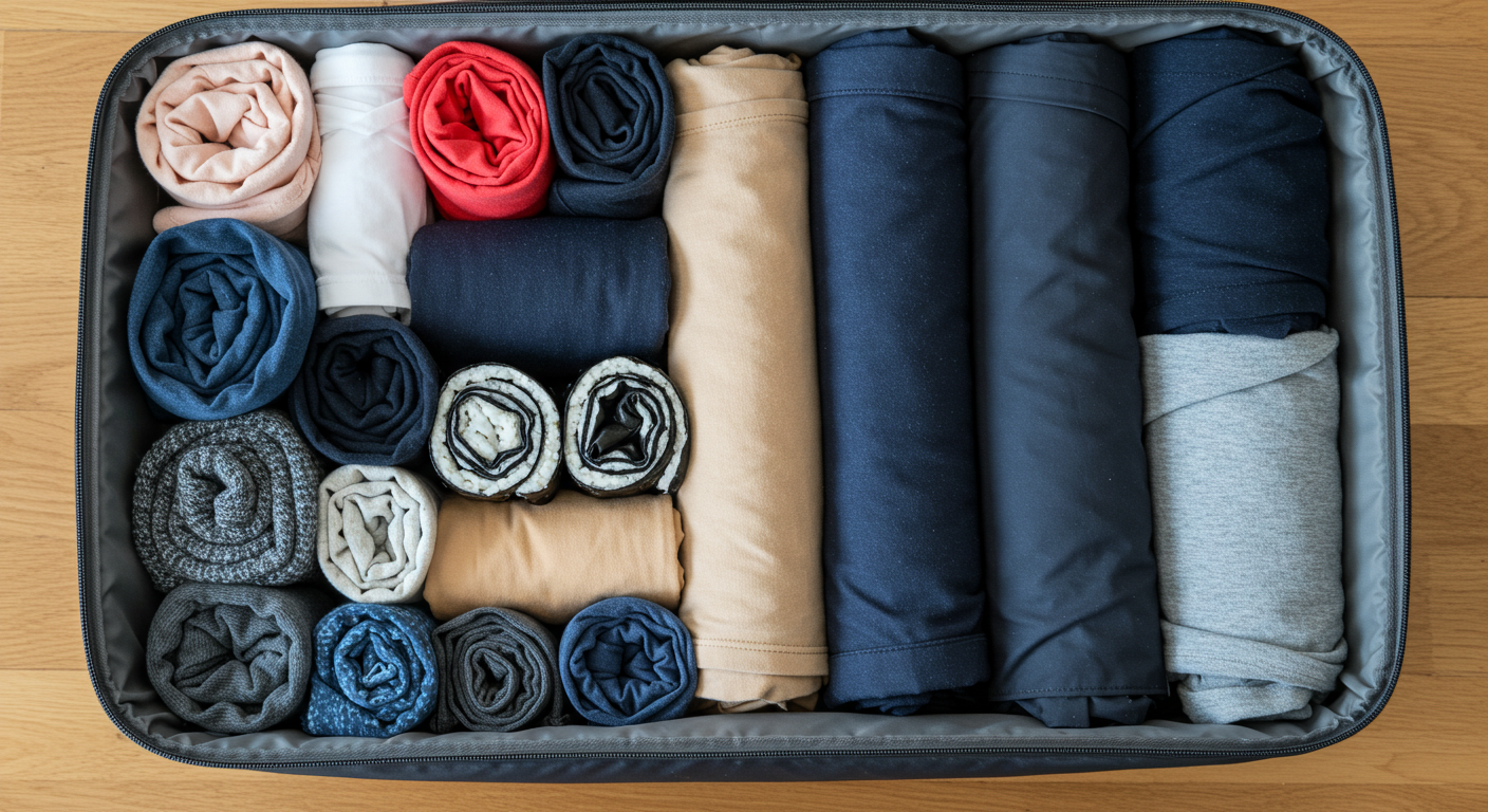 ▶ 의류는 롤 형태로 말기, 진공팩·압축팩 사용, 체크리스트 작성, 불필요한 물품 과감히 제외 등 공간 절약과 효율적인 짐 싸기 노하우를 소개합니다. - 여행 짐 싸기 꿀팁, 준비 시간을 반으로 줄이는 실천 전략 - 유용한정보
