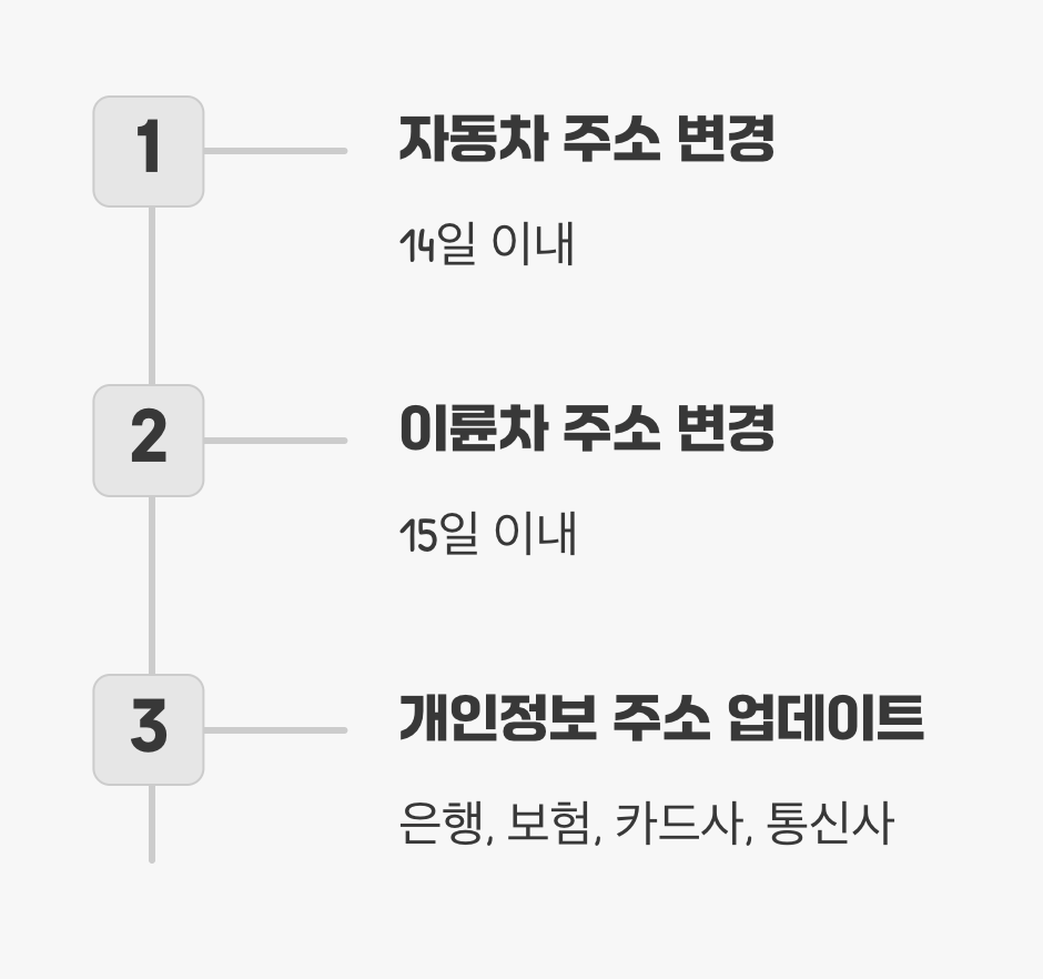 전입신고와 확정일자까지 마쳤다면, 이제 남은 행정 처리를 마무리할 차례입니다. 14일 이내에 자동차를 소유하고 있다면 자동차 주소 변경 등록을 해야 하고, 이륜차의 경우 15일 이내에 신고해야 합니다. 이 역시 정부24나 자동차민원 대국민포털에서 온라인으로 처리 가능합니다.