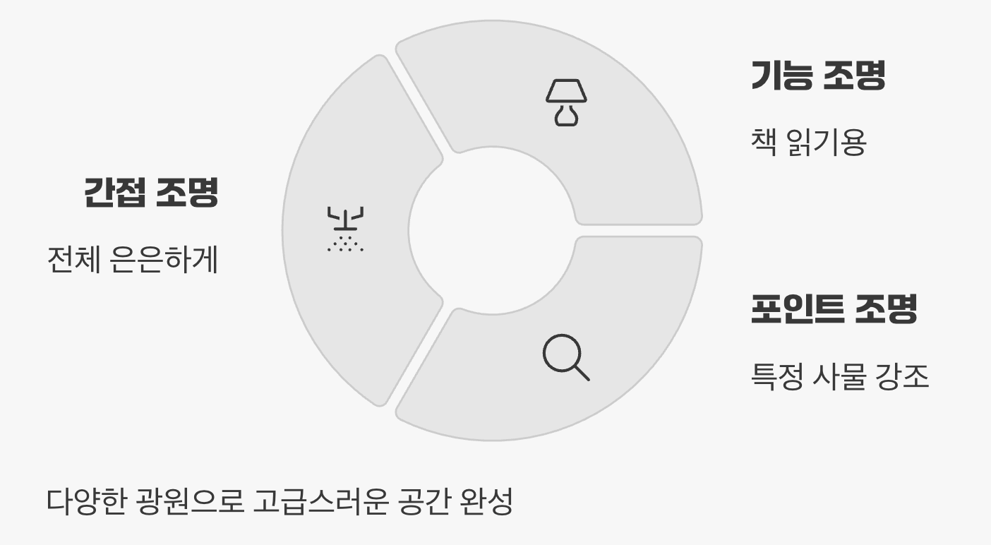 예를 들어 거실이라면, 전체를 은은하게 밝혀주는 간접 조명(천장 등), 책을 읽을 때 필요한 스탠드 조명(기능 조명), 그리고 벽의 그림을 비추는 스팟 조명(포인트 조명)을 함께 사용하는 식입니다. 이렇게 목적이 다른 여러 광원을 함께 사용하면, 상황에 따라 필요한 빛만 켜서 다양한 분위기를 연출할 수 있고, 공간은 훨씬 더 고급스럽고 입체적으로 완성됩니다.