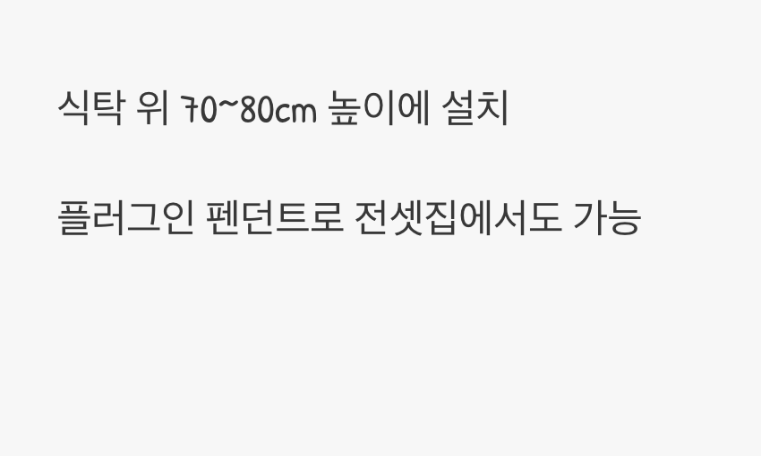 펜던트 조명은 식탁 주변을 하나의 독립된 공간으로 구분해 주면서, 음식에 시선을 집중시켜 더욱 맛있어 보이게 하는 효과가 있습니다. 가장 이상적인 설치 높이는 식탁 표면에서 약 70~80cm 위로, 앉았을 때 조명이 시야를 가리지 않으면서도 빛이 충분히 집중되는 높이입니다. 최근에는 전선 공사 없이 콘센트에 꽂아 바로 사용할 수 있는 플러그인 펜던트 조명도 많아, 전셋집에서도 부담 없이 설치할 수 있습니다.