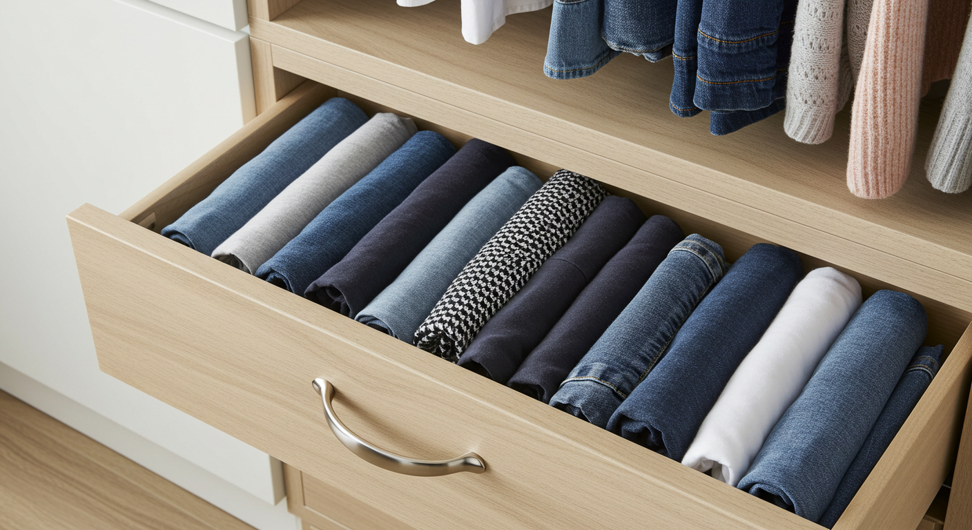 블라우스, 셔츠, 원피스, 재킷처럼 구김이 잘 가거나 형태가 중요한 옷들은 옷걸이에 걸어 보관하세요. 반면, 니트처럼 늘어지기 쉬운 옷이나 티셔츠, 청바지처럼 부피가 큰 옷들은 접어서 보관하는 것이 좋습니다. 이때, 서랍 속 옷들을 책처럼 세워서 보관하는 ‘세로 수납법’을 활용해 보세요. 어떤 옷이 있는지 한눈에 파악할 수 있어 옷을 찾느라 서랍을 뒤지는 일이 사라지는 놀라운 해결책이 되어줍니다.