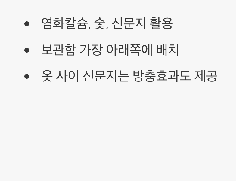 시중에서 쉽게 구할 수 있는 염화칼슘 제습제나 숯, 혹은 신문지를 적극적으로 활용해 보세요. 습기는 아래로 가라앉는 성질이 있으므로, 제습제는 보관 상자나 옷장의 가장 아래쪽에 두는 것이 효과적입니다. 또한, 옷 사이사이에 신문지를 한 장씩 끼워 넣으면 습기를 흡수할 뿐만 아니라, 신문지 잉크 성분이 해충을 쫓는 방충 효과까지 덤으로 얻을 수 있습니다.
